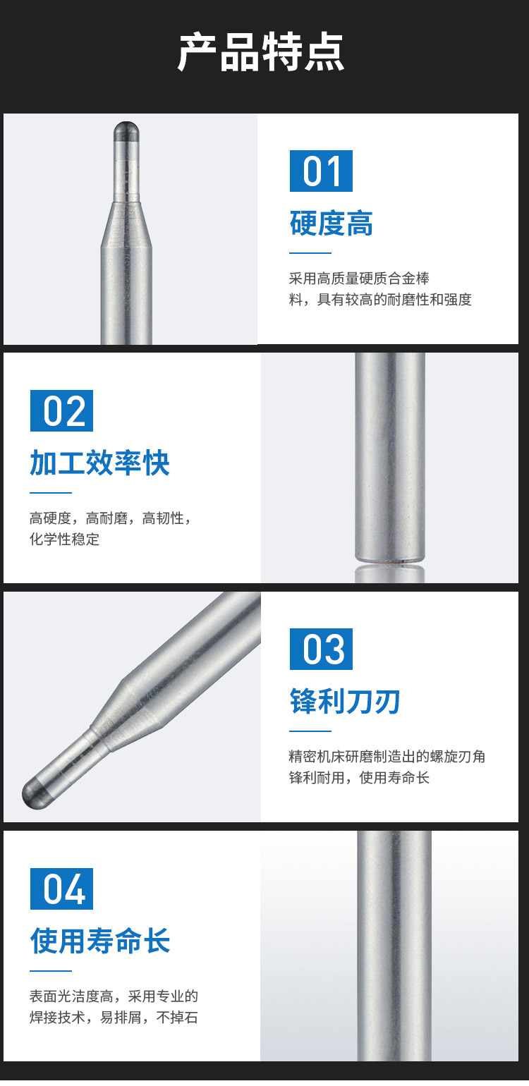 1.硬度高:采用高质量硬质合金棒料,具有较高的耐磨性和强度;